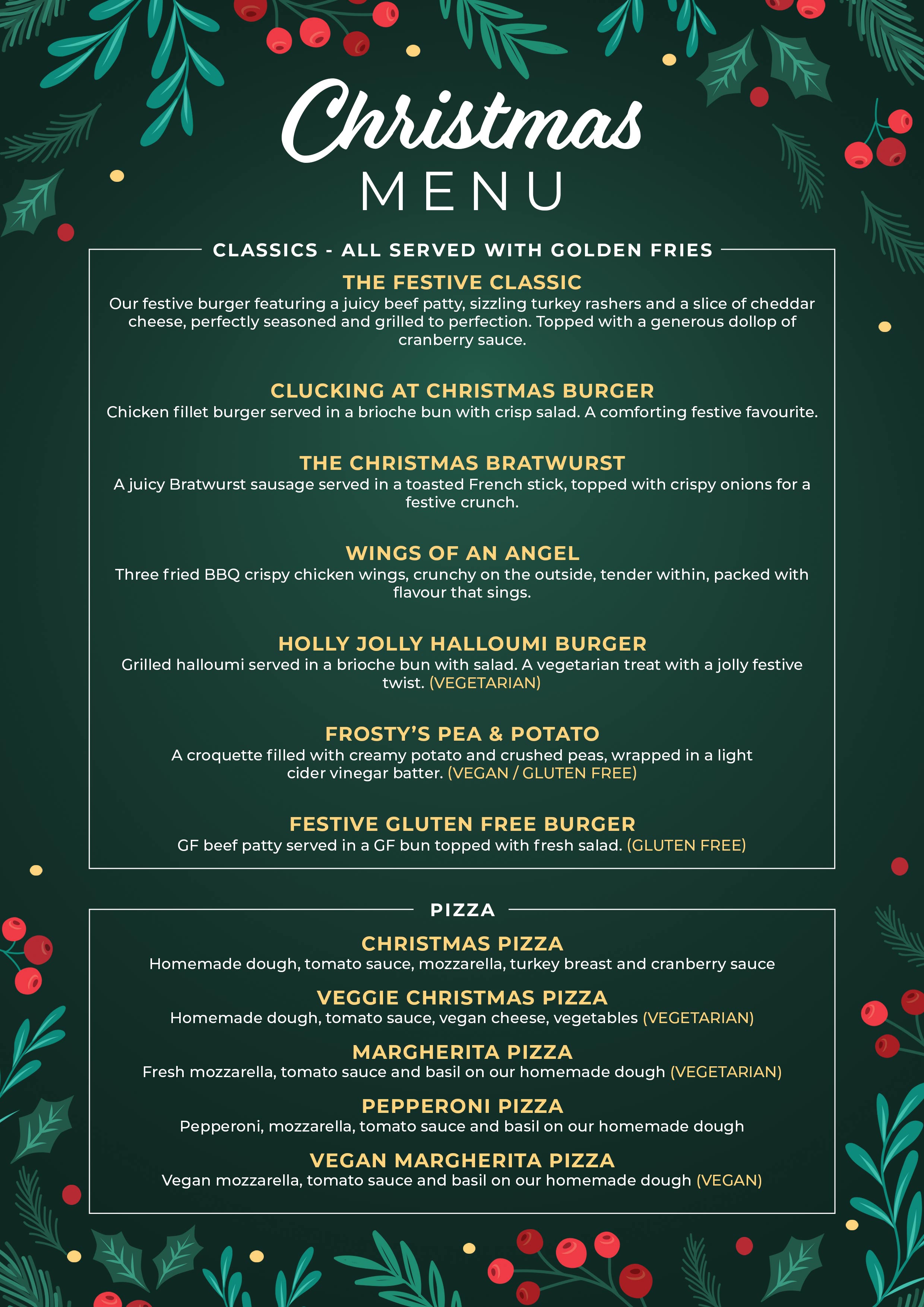 š- A delicious street food meal of your choice. Choose on the day from an array of Festive or regular meal choices from multiple street food vendors in 'The Garden' part of the Fire Complex which is then delivered inside the venue to your table - No need to pre-order! Including Italian, Chicken, Hot Dogs & Burger options, plus gluten free, vegetarian & vegan options all catered for.